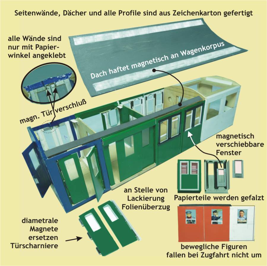 Das Dach von geschlossenen Fahrzeugen haftet mit Magnetband am Wagen-Korpus. Fenster lassen sich mit Hilfe eines magnetischen Stabes rauf- und runterschieben. Die Türschlösser schließen magnetisch. Mechanische Türscharniere werden durch diametral magnetisierte Rundstäbe ersetzt. Dank Miniaturmagnete kann man die Mitfahrenden im Zug umsetzen.
