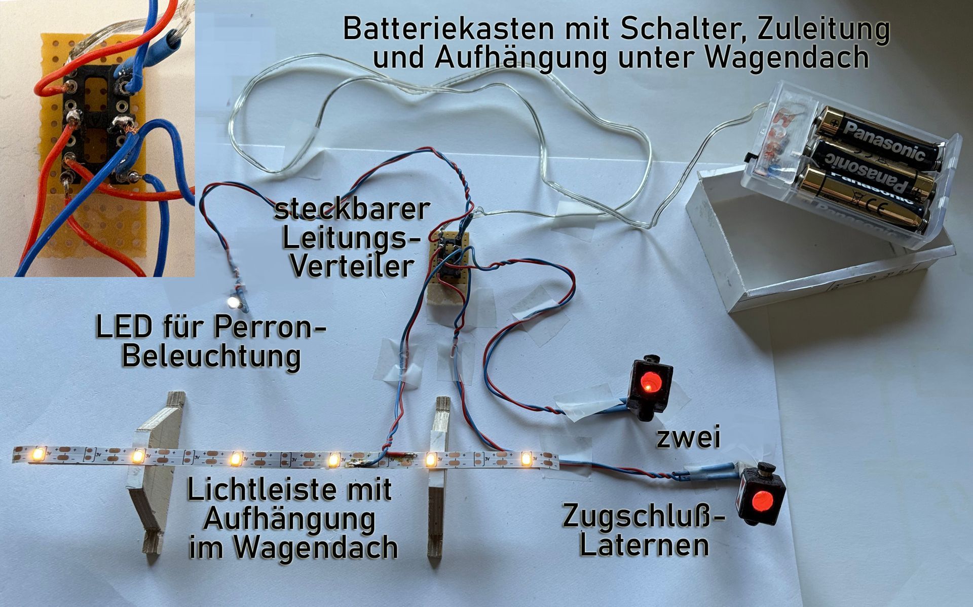 Die Türgriffe werden aus Platinen-Steckverbindern gebogen. Die Handläufe bestehen aus Blumendraht mit Manschetten aus Tonpapier. Ein Handrad kann ein Metall-Druckknopf oder ein verzinntes Uhrenrad sein. Der Puffer wird aus einem Tonpapierring geschnitten, der mehrfach um eine Flasche gewickelt wurde. Der Dachlüfter ist eine Wanderschuh-Niete, die mit einem Kouvert-Verschluß im Dach drehbar befestigt ist. Für die Bremsschläuche zwischen zwei Wagen wird Zierkordel verwandt. Als Kupplung dienen zwei Speichermuttern vom Fahrrad. In ihnen ist ein Miniaturmagnet versteckt. Die Durchführung zum Wageninnern ist eine Hohlniete. Das Geländer besteht aus Blumendraht, die Ösen wurden aus Kupferdraht selbst "geschmiedet" und gebohrt.