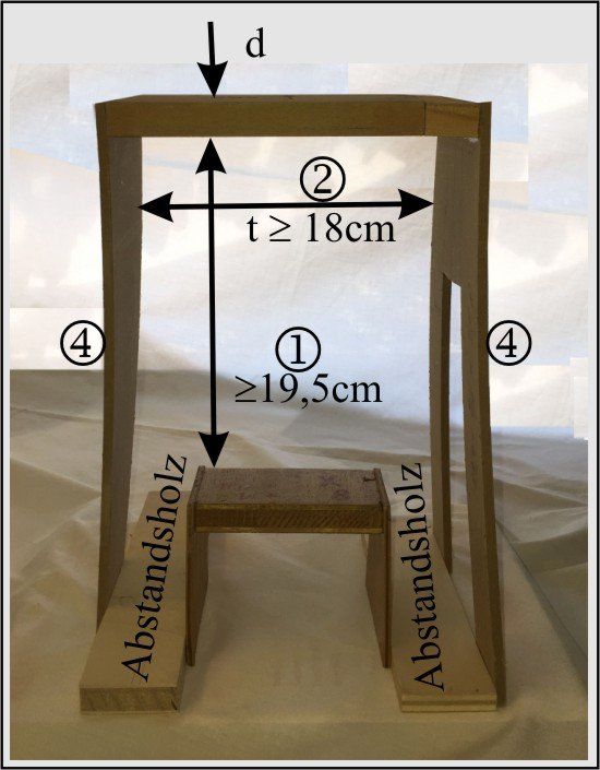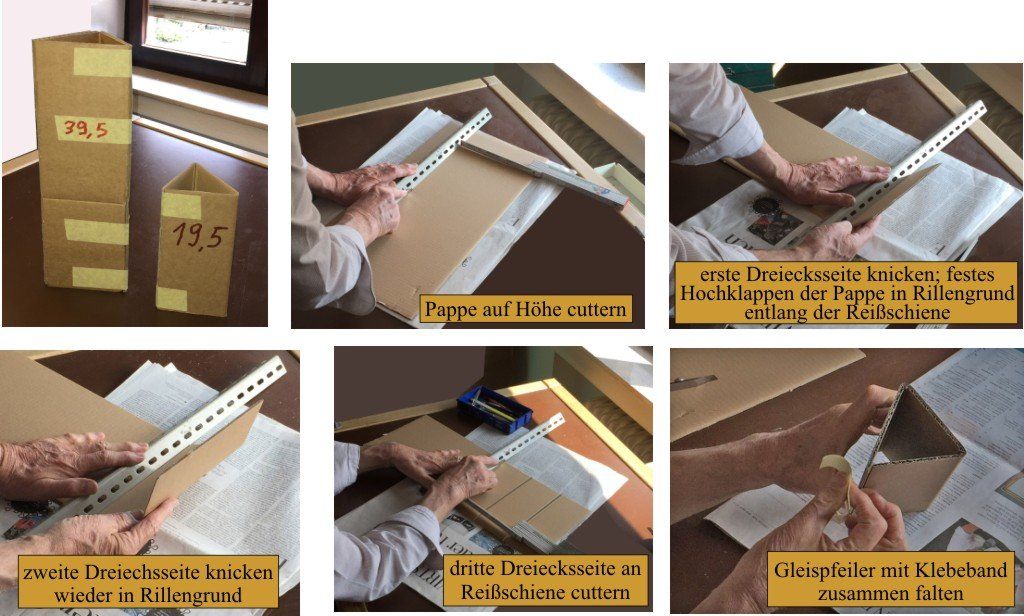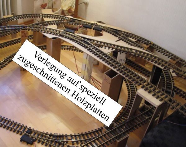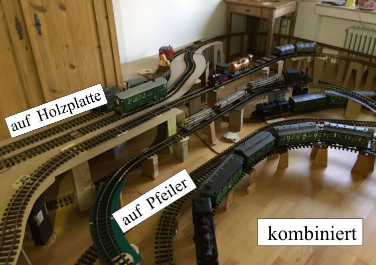Mein höchstes Fahrzeug -auf einem Gleis aufgesetzt- ist 19 cm hoch. Deshalb habe ich als Höhe der ersten Fahrebene 20 cm, bei der zweiten Fahrebene 40 cm gewählt. Da eine Platte ca. 0,5 cm dick ist, sind die Plattenstützen 19,5 cm bzw. 39,5 cm hoch. Da bei Gleispfeilern die Gleise auf dem Schienenbett aufliegen, muß die Schwellenhöhe dazu addiert werden, also 20 cm + 0,5 cm = 20,5 cm bzw. 40,5 cm.