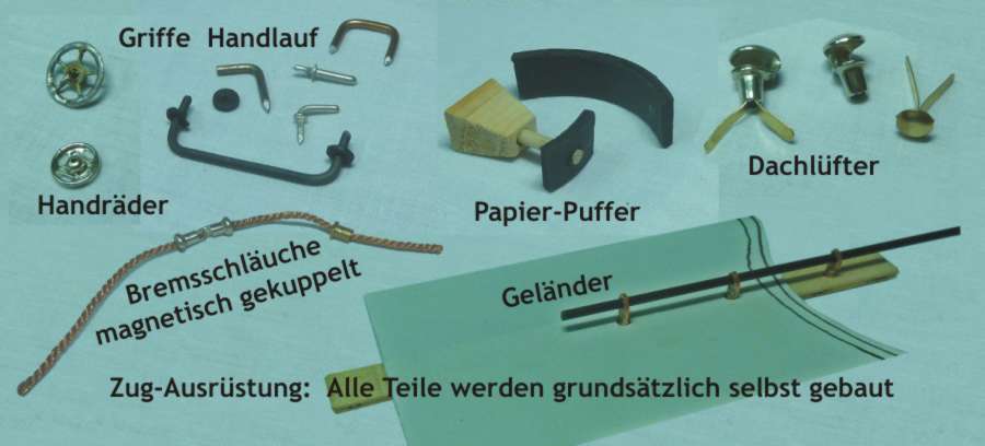 Die Türgriffe werden aus Platinen-Steckverbindern gebogen. Die Handläufe bestehen aus Blumendraht mit Manschetten aus Tonpapier. Ein Handrad kann ein Metall-Druckknopf oder ein verzinntes Uhrenrad sein. Der Puffer wird aus einem Tonpapierring geschnitten, der mehrfach um eine Flasche gewickelt wurde. Der Dachlüfter ist eine Wanderschuh-Niete, die mit einem Kouvert-Verschluß im Dach drehbar befestigt ist. Für die Bremsschläuche zwischen zwei Wagen wird Zierkordel verwandt. Als Kupplung dienen zwei Speichermuttern vom Fahrrad. In ihnen ist ein Miniaturmagnet versteckt. Die Durchführung zum Wageninnern ist eine Hohlniete. Das Geländer besteht aus Blumendraht, die Ösen wurden aus Kupferdraht selbst "geschmiedet" und gebohrt.