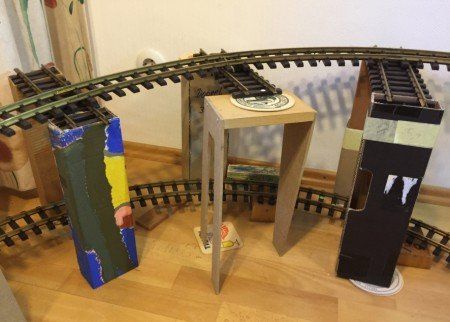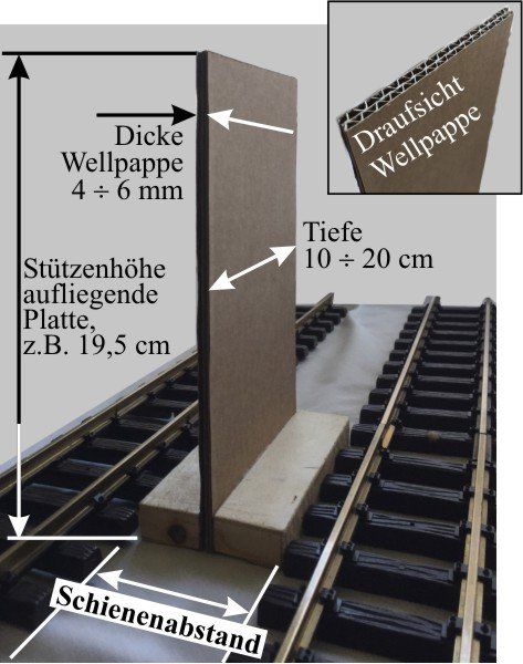 Mein höchstes Fahrzeug -auf einem Gleis aufgesetzt- ist 19 cm hoch. Deshalb habe ich als Höhe der ersten Fahrebene 20 cm, bei der zweiten Fahrebene 40 cm gewählt. Da eine Platte ca. 0,5 cm dick ist, sind die Plattenstützen 19,5 cm bzw. 39,5 cm hoch. Da bei Gleispfeilern die Gleise auf dem Schienenbett aufliegen, muß die Schwellenhöhe dazu addiert werden, also 20 cm + 0,5 cm = 20,5 cm bzw. 40,5 cm.