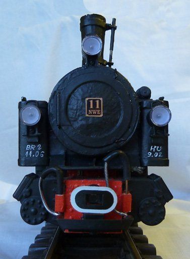 Das ist das Prunkstück in meiner Sammlung und 5kg schwer. Der sichtbare Aufbau ist altbewährt in meiner Papier-Fertigungstechnologie hergestellt. Darunter befindet sich stabile Sperrholzkonstruktion. Die Motorblöcke sind aus Messing. Die Zugkraft dieser Lok wird nicht durch die Zahl der angehängten Waggons begrenzt, sondern durch die Zuglänge (die vorderen Wagen sind zu leicht und entgleisen in Kurven).