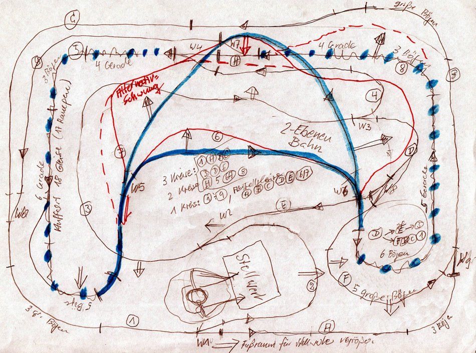 Wenn Sie auf das Bild klicken, dann sehen Sie das Original-Papierkonzept einer meiner Zimmeranlagen. Das ist aber nicht das erste Schmierpapier, sondern mindestens die vierte Version meines Gleis-Rohentwurfs. Bei mir ist immer das oberste Entwurfsziel der Ein-Kreis-Betrieb