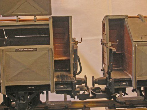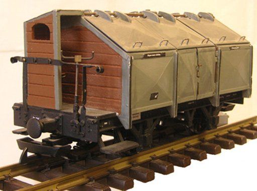 Das ist ein sehr attracktives robustes Modell mit zwei hölzernen Seitenwänden und vierzehn gewölbten Stahlwänden aus Papier. Der Klappenmechanismus besteht aus 2 mm starkem Schweißdraht. Er ist dreimal gelagert: in Wagenmitte und in den Seitenwänden. Auf dem Schweißdraht sind die Dachklappen klemmend aufgeschoben. So läßt sich jede Klappe einzeln mit der Hand bewegen. Bewegt man hingegen den Drahtbügel an der Stirnwand, so öffnen oder schließen alle Dachklappen auf einmal. Die Bremserhäuschen schützen nur notdürftig gegen Wetter und Wind.