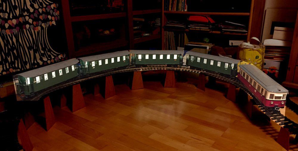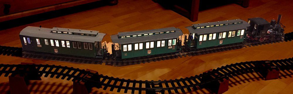 Im Jahr 2025 wurde beim Hoayer Dampftriebwagen die stromfressende Birnen-Innenbeleuchtung durch eine LED-Lichterkette ersetzt. Sie ist ausschließlich am magnetisch haftenden Dach fest montiert. Dieser Link hier führt zum beleuchteten Dampftriebwagen-Zug.