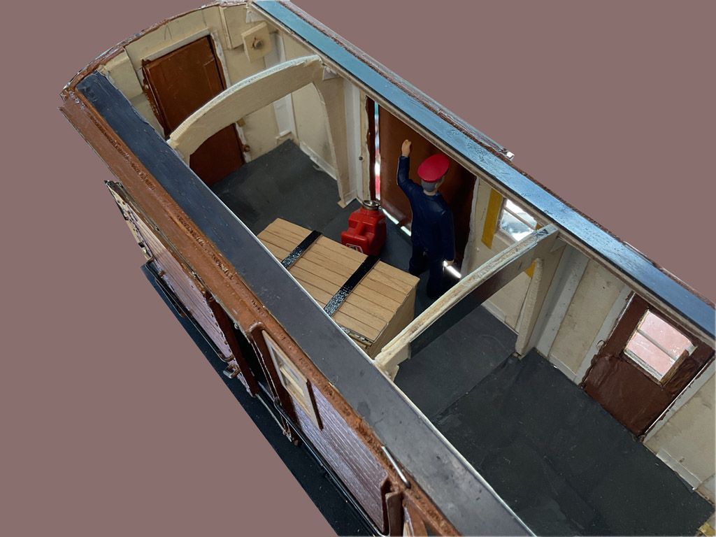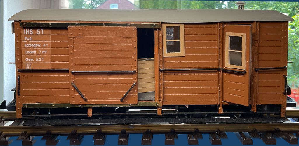 Das Spur-G-Modell ist sehr grazil gebaut. Viele mit Nieten geprägte Papierprofile verzieren den hölzernen Wagenkasten. Dieser liegt um 6 mm tiefer als bei LGB-Modellen üblich*). Prägnant sind die Trittbretter in Wagenlänge mit umlaufenden Griffstangen. Und ein Wellblech-Dach, was der Lokomane immer einmal realisieren wollte.